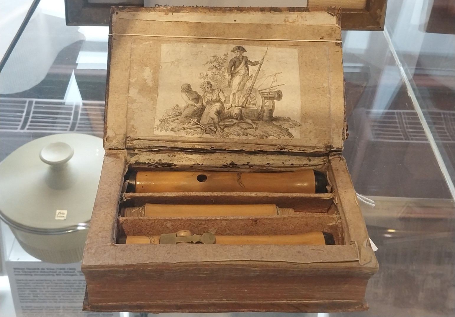 The Edam Museum collection holds a remarkable booklet with three recesses containing a hidden flute! The inside features a mysterious print from circa 1784-1786: a militiaman crushing Violence. What does this vignette mean? Who donated the book, and why did the flute have to remain hidden? Truly, a hidden story.