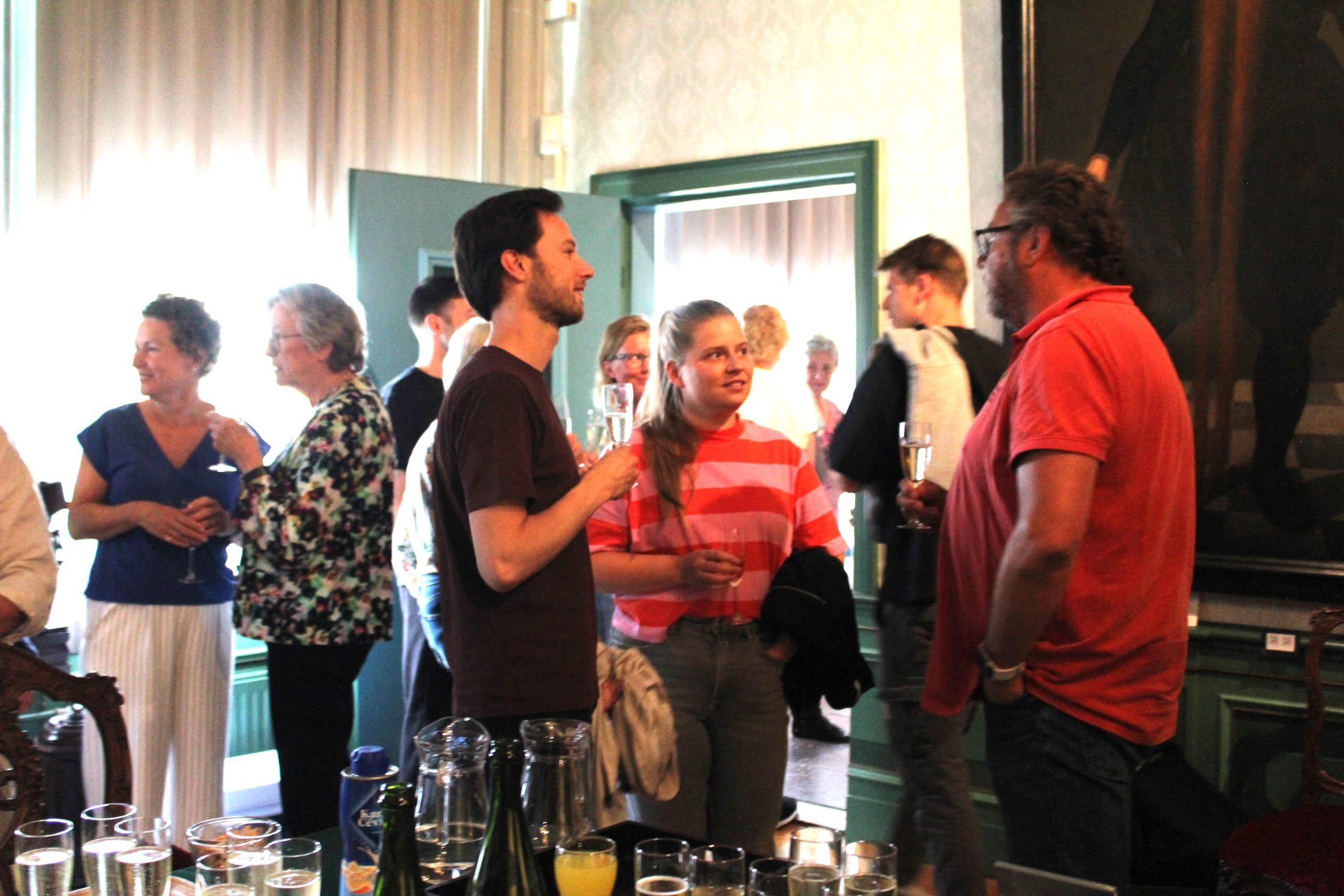 De uitgenodigde bewoners kregen in een korte lezing in de Raadzaal door de altijd bevlogen historica en conservator Julie Hengeveld een treffend beeld geschetst van ‘de Lange Meyt’ en het Edam uit háár tijd, een chocoladeflic met Trijntjes beeltenis erop – vervaardigd door banketbakkerij Mastenbroek – en natuurlijk het boekje over de Drie Mirakelen. Het gezelschap ging vervolgens naar boven, naar de schilderijen in de voormalige burgemeesterskamer waar de drie schilderijen hangen met de schoenen van Trijn eronder, en in de hal konden de buren zichzelf met Trijntje meten: wie is de langste bewoner van de straat, en wie de kleinste. Bovendien was er ook nog een jóngste buurtbewonertje: deze paste, slechts twee maanden oud, in zijn maxicosi prima tussen de prikslee en de kinderwagen van de jubileumtentoonstelling.